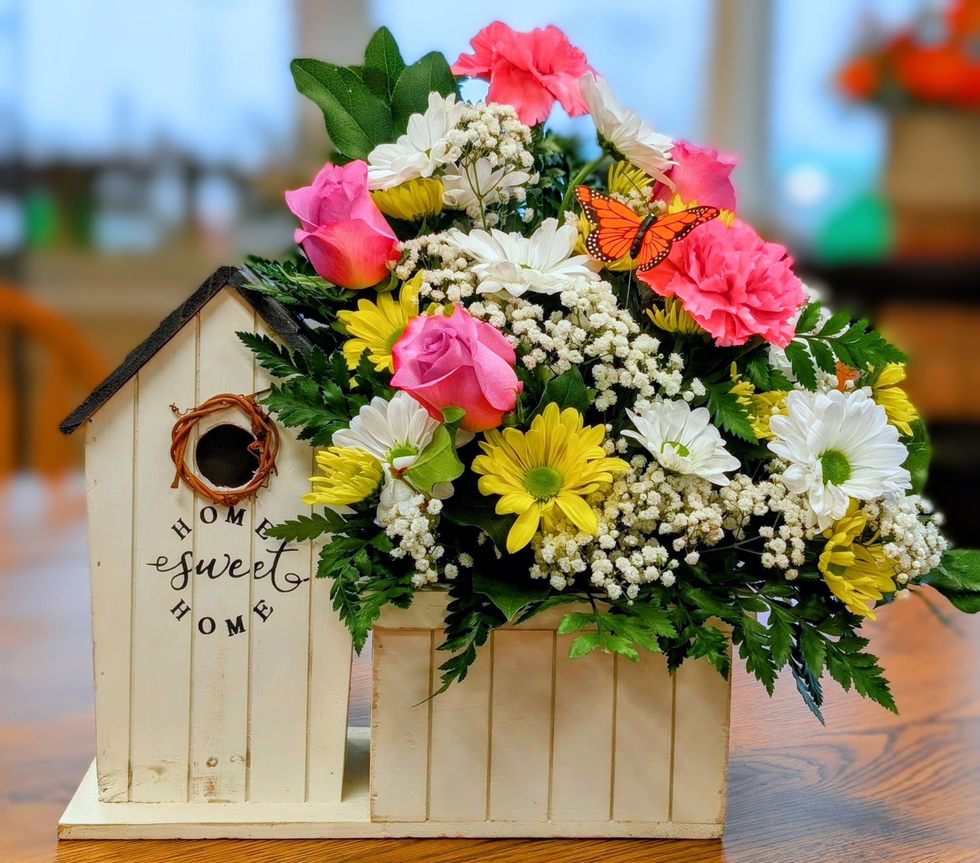 A cheerful arrangement designed to brighten any space. This one sided bouquet features roses, daisies, carnations, baby’s breath, and fresh greens arranged around a charming “Home Sweet Home” birdhouse and accented with a butterfly. A perfect gift for housewarmings, celebrations, or just because. Approximate size: 15" H x 15" W.