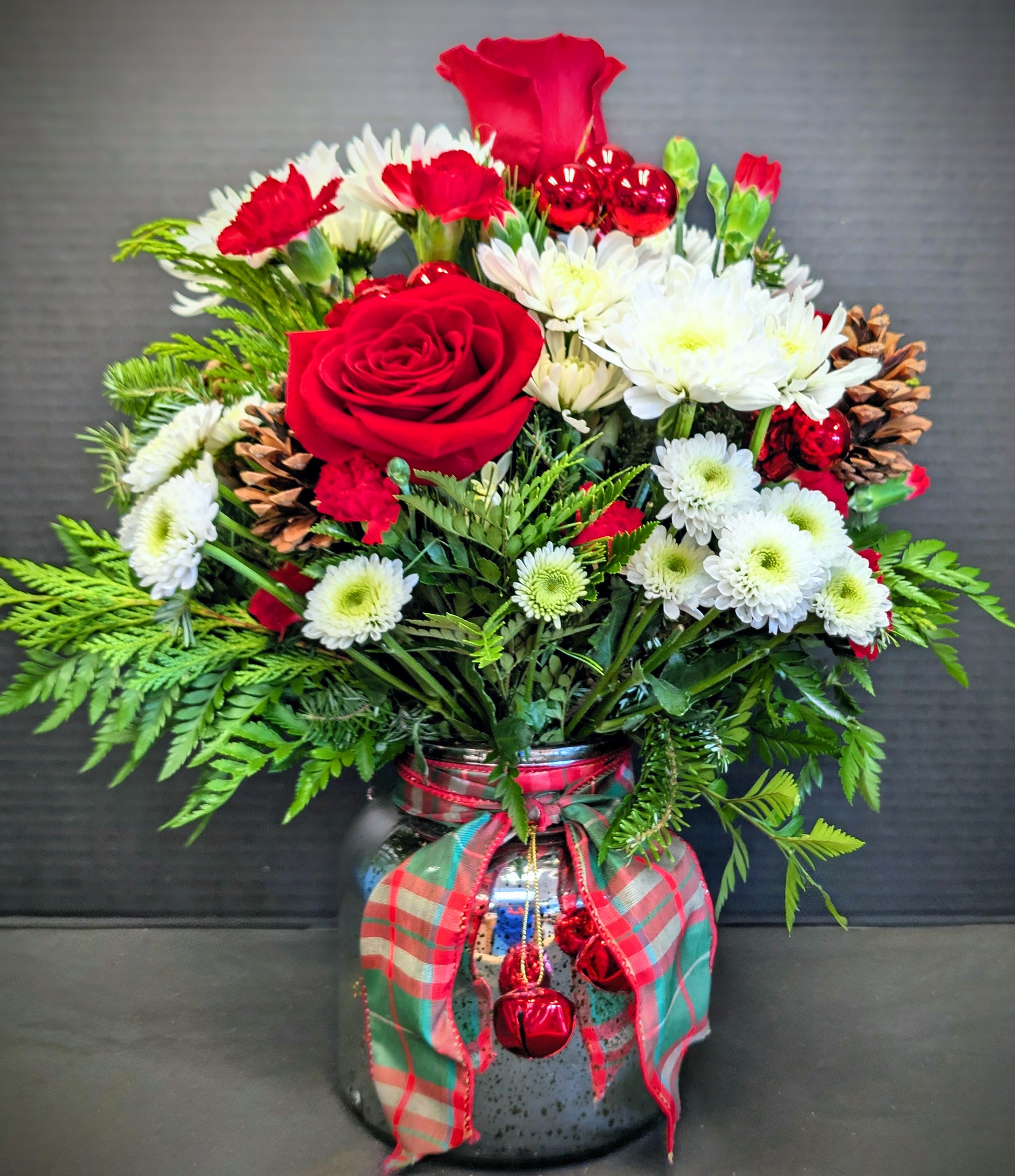 This festive winter design features mixed seasonal greens accented with pine cones, pops of red, and soft white blooms. Arranged in a silver jar style container, it is finished with a plaid ribbon and red jingle bells around the neck for a cozy, classic winter look. Perfect for seasonal decorating or gifting throughout the winter months.