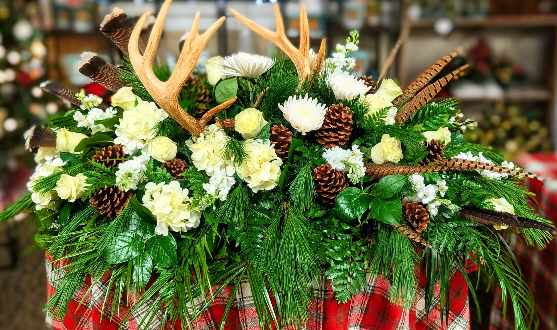 This elegant casket spray blends natural elements and soft white florals to create a peaceful tribute. The deer antlers, pheasant tail feathers, and turkey feathers were provided by the family, adding a deeply personal touch. These meaningful items are paired with white roses, hydrangeas, stock, fuji mums, pine cones, and a mix of winter and other greens for depth and texture. A serene, woodland-inspired expression of love and remembrance.