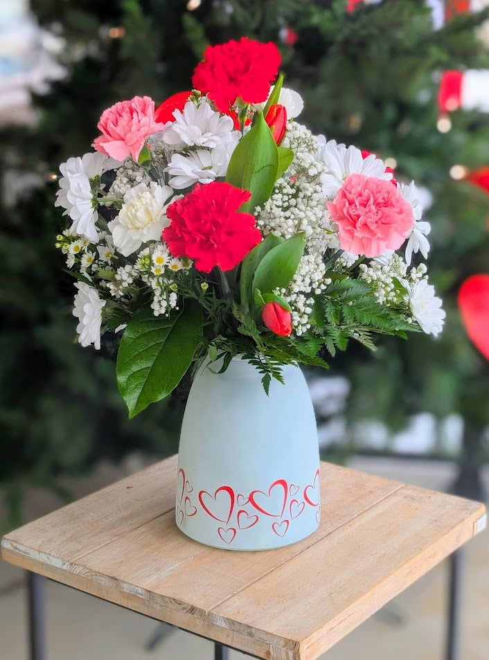 This elegant arrangement features rich red, pink and pure white carnations mixed colored tulips and white daisies in an white vase with hearts around the bottom. The contrast between the deep reds, pinks and soft whites creates a romantic yet sophisticated look, perfect for conveying both love and elegance.